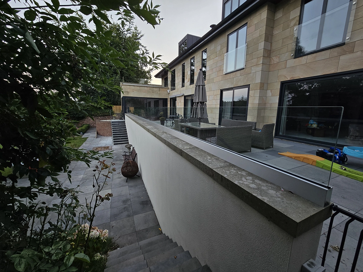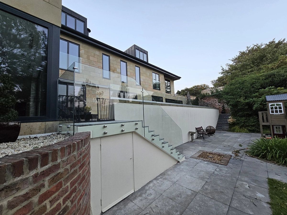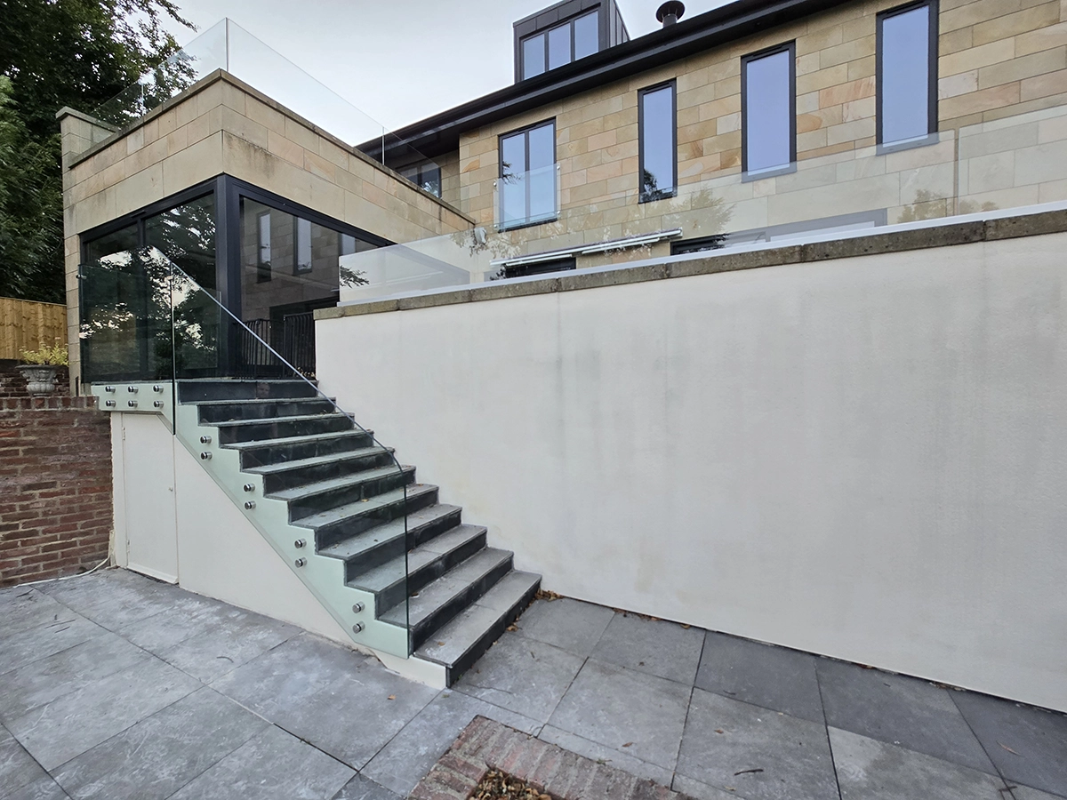 Glass panels have also been installed alongside the external staircase, providing a sleek and practical safety solution without detracting from the contemporary look of the property. Stainless steel fixings secure the glass neatly in place, complementing the modern architecture and stone exterior.