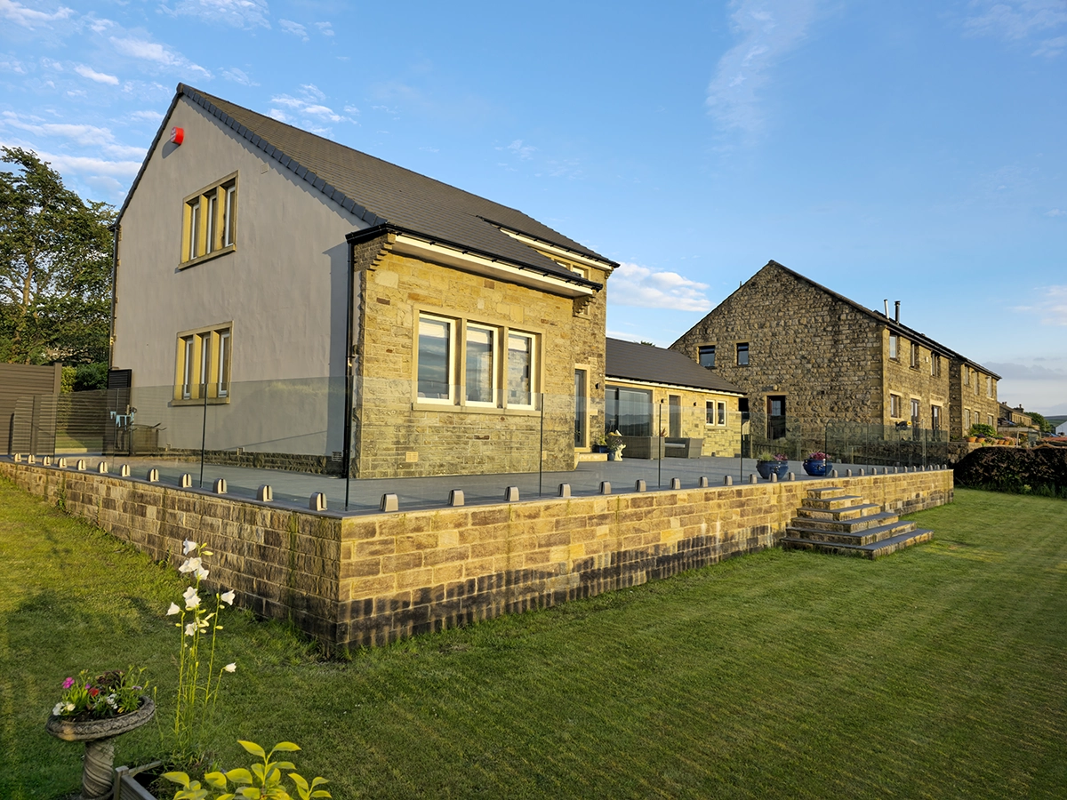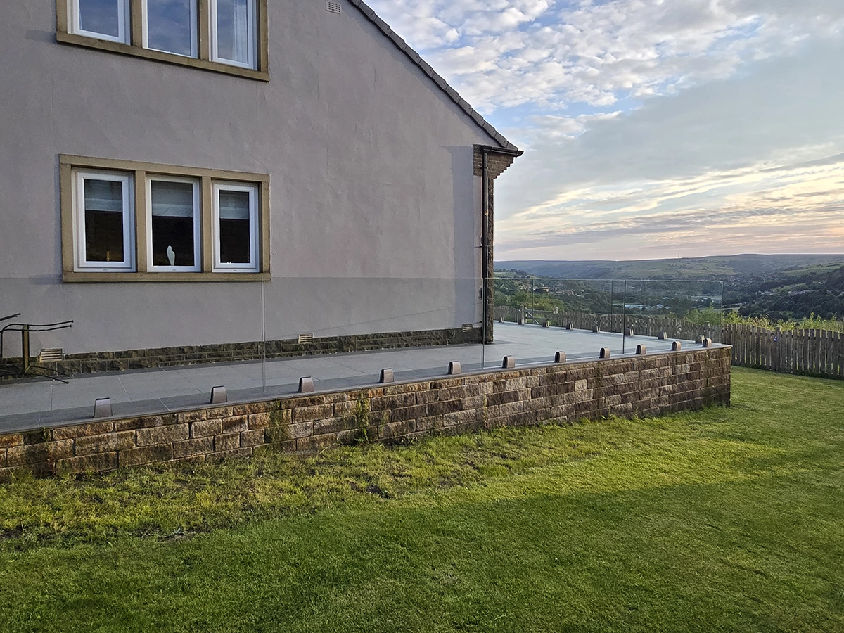 This Linthwaite project features a frameless glass balustrade installed around a large, raised patio area at the rear of the property. The clear glass panels are fixed using low-profile stainless steel base clamps, creating a continuous, minimal barrier along the edge of the terrace while maintaining open views across the surrounding landscape.