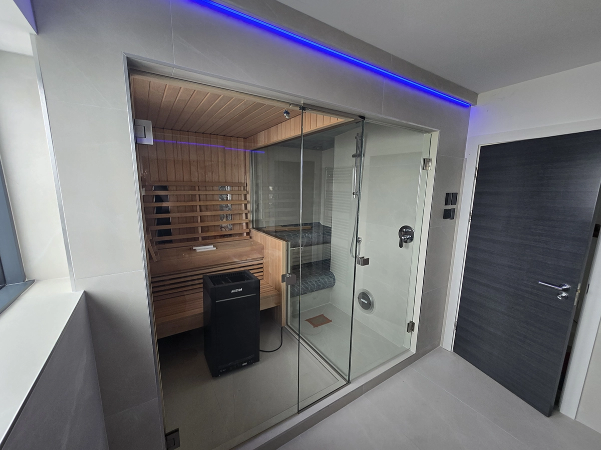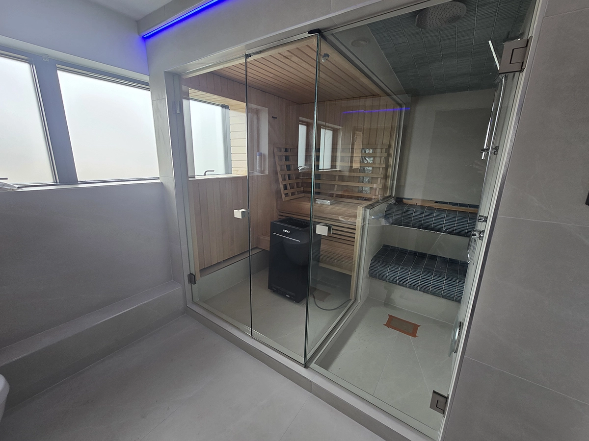 This bespoke installation combines a fully glazed sauna enclosure with a frameless shower, creating a clean and contemporary wellness space. Toughened glass panels were precisely measured and fitted to maximise light while maintaining clear separation between the sauna and wet area.
