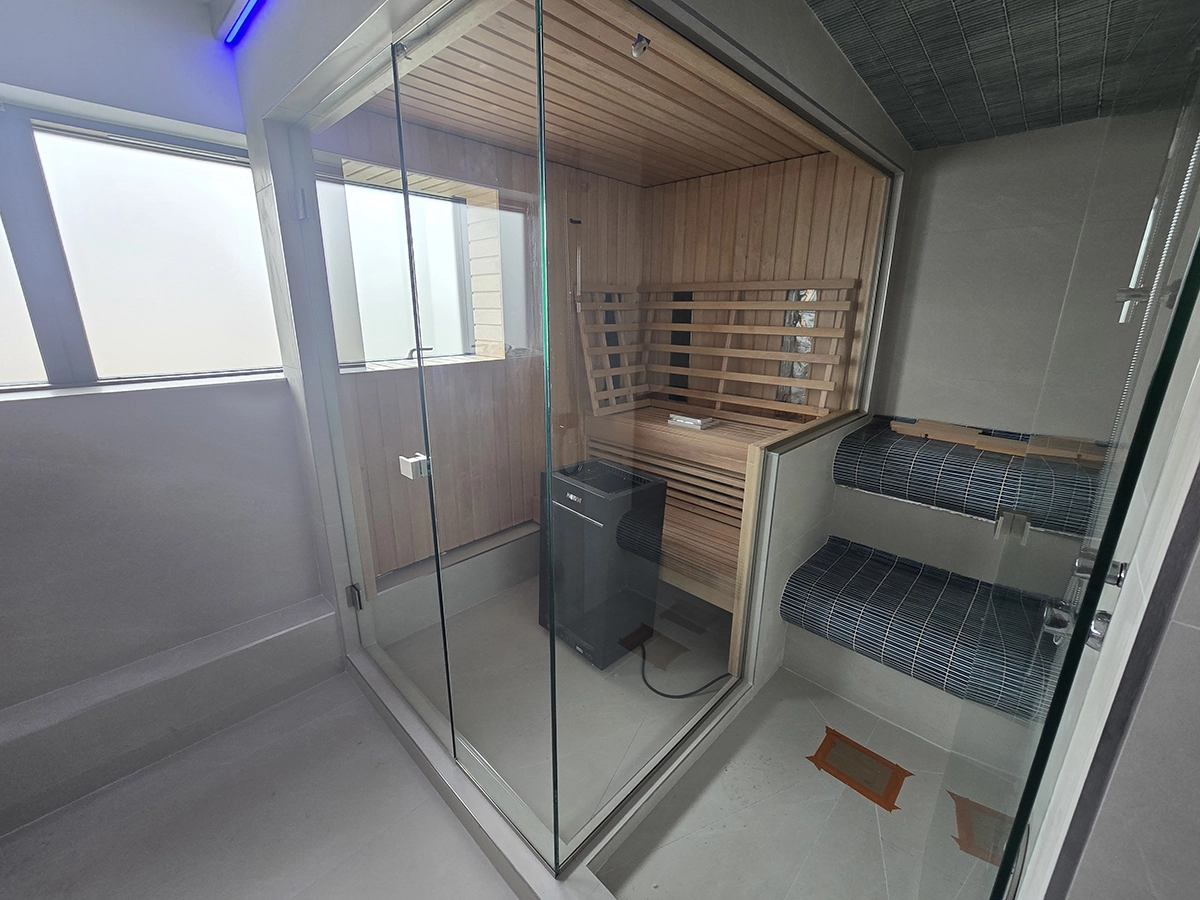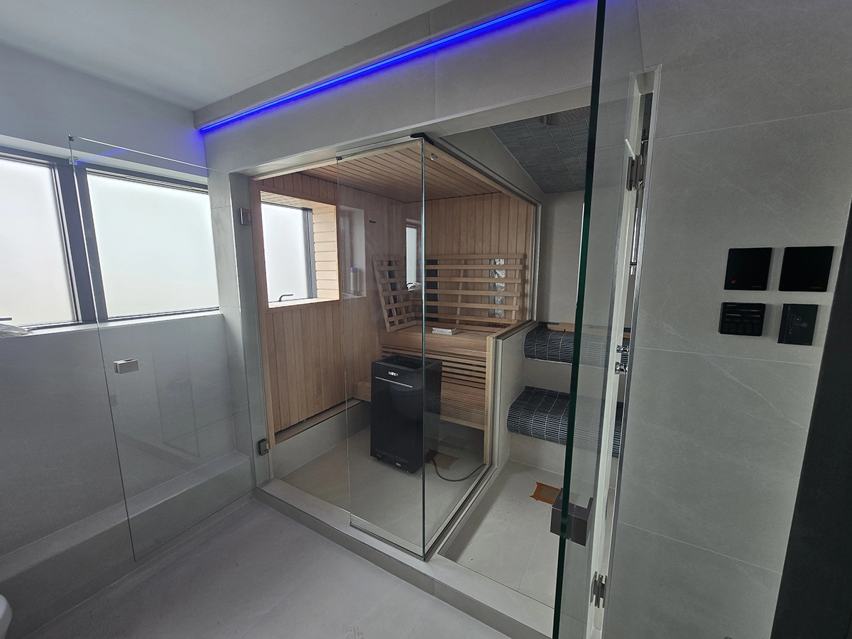 The minimalist glass detailing complements the modern interior, allowing the timber sauna to remain the focal point while ensuring durability and ease of maintenance. A seamless finish and discreet fixings help deliver a sleek, high end result suited to a luxury residential setting.